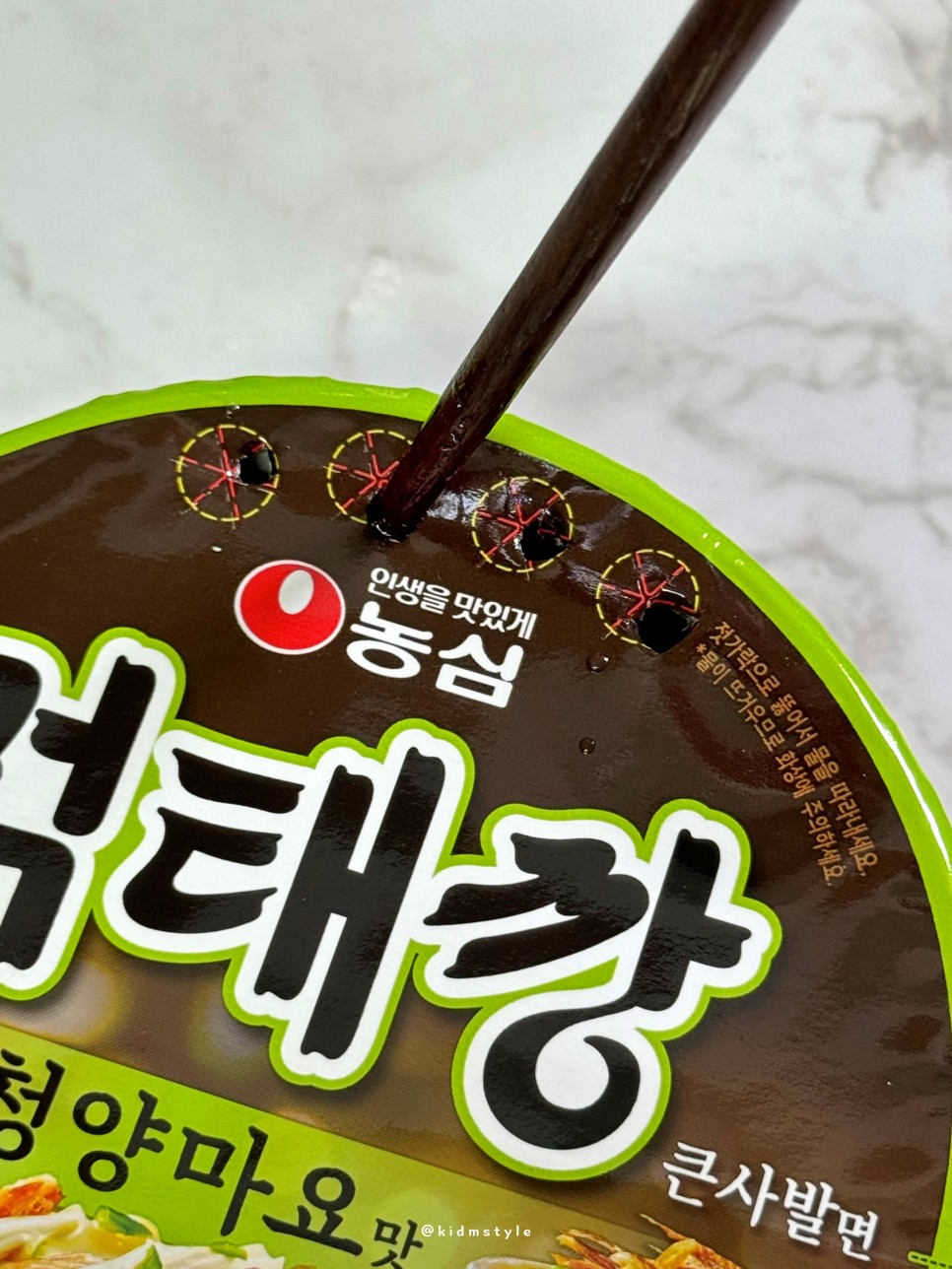3분 뒤 물을 버리기 위해 구멍을 뚫어 준다.