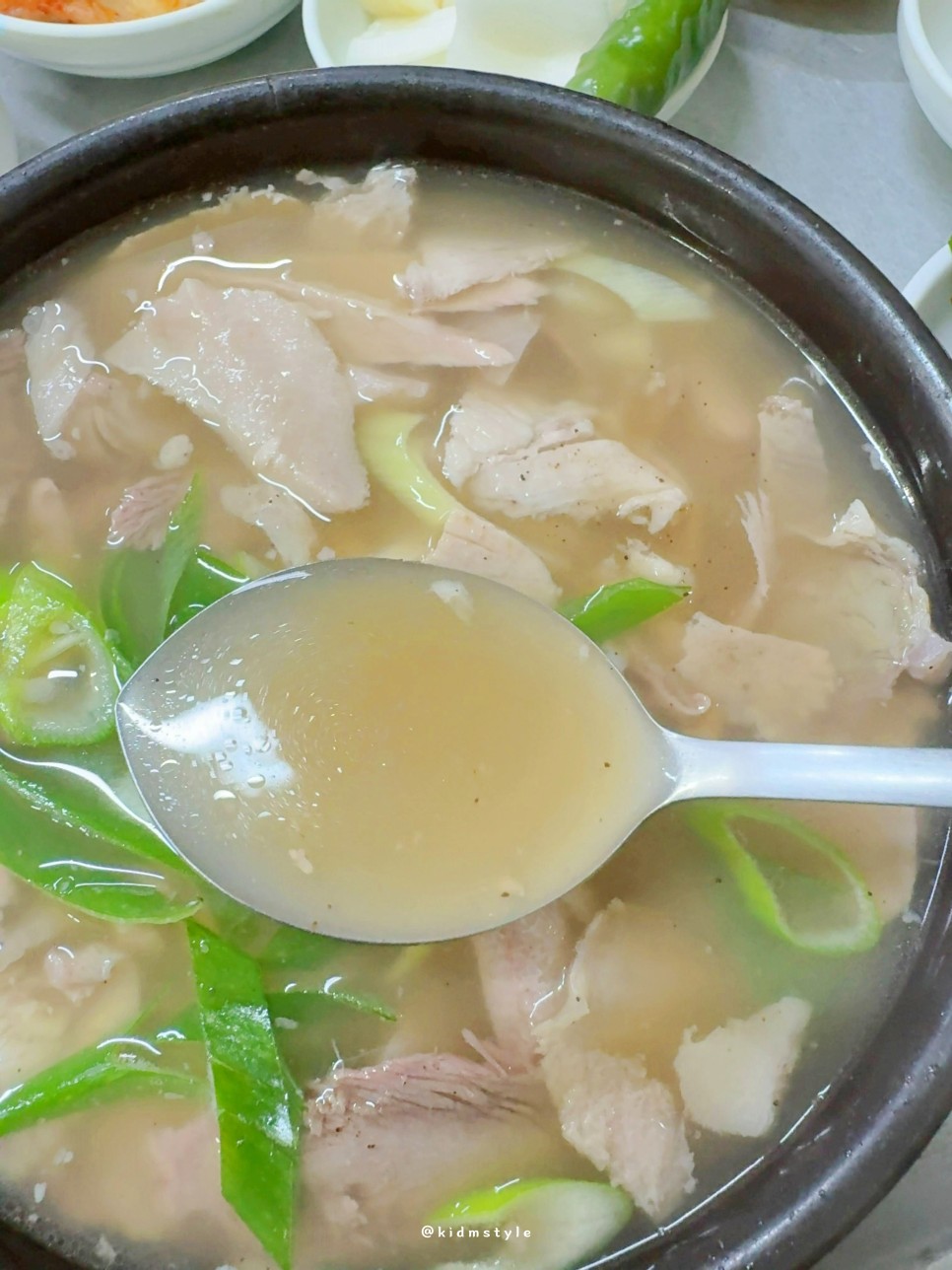 이 집 돼지국밥을 좋아하는 이유가 고기가 부드럽고 잘 씹히면 부담스럽지가 않다. 얇게 썰어서 그런 것도 있다.