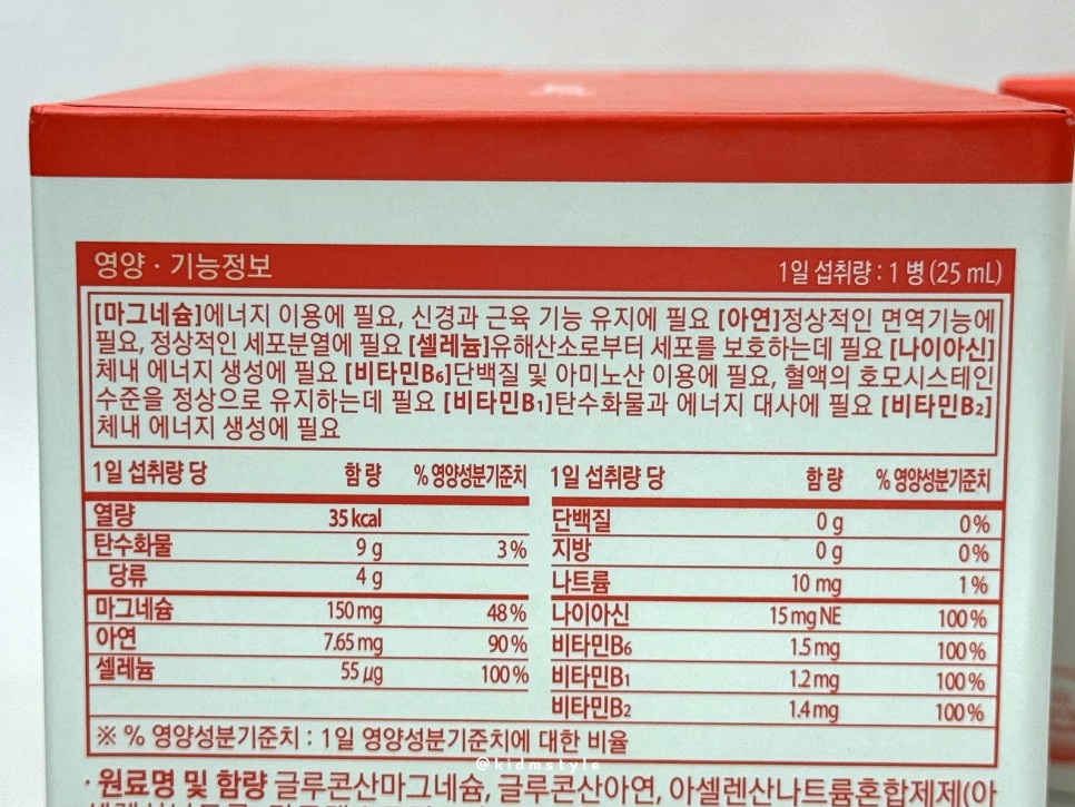 마그뮨 영양 기능 정보가 자세하게 적혀 있다. 1일 섭취량 1병 25ml 기준이다.