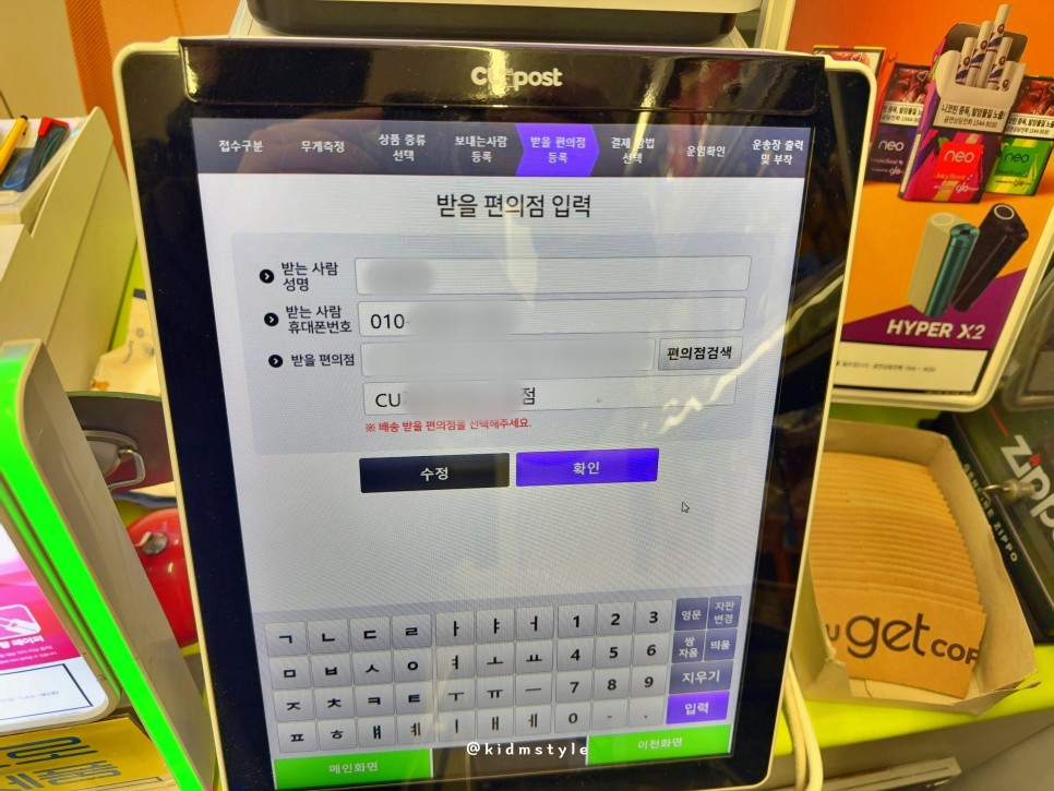 이어서 받는 사람의 정보를 입력하게 되는데 이름, 휴대폰 번호, 상대방이 받을 편의점을 정확하게 입력해야 한다.