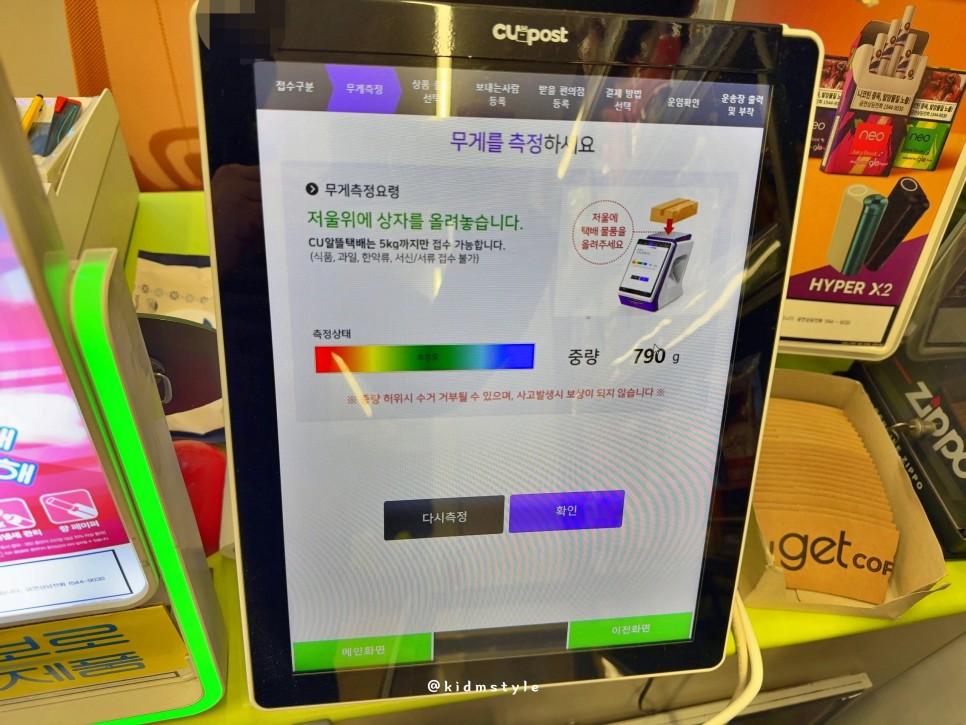 포장된 상자를 기기 위 저울에 올려준다. 중량에 따라 금액이 달라지며 내가 포장한 박스는 790g이다.