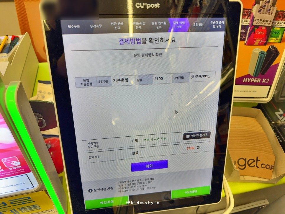 같은 부산이라 동일권이며 790g의 무게라 총 결제 운임은 2,100원이 나왔다.