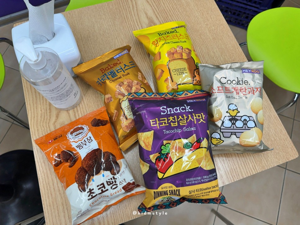 어떤 선물을 보낼까 고민하다가 시간이 경과해도 문제가 없는 제품으로 골라보았다. CU 자체 브랜드인 HEYROO 헤이루 제품 중에서 맛있는 과자 위주로 골랐다. 그리고 인기 있는 빵부장도 넣고.