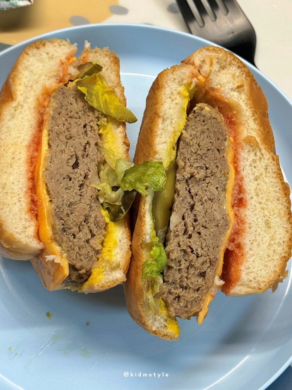 칼로 반을 잘라보았는데 생각 외로 패티가 두꺼운 편이다.