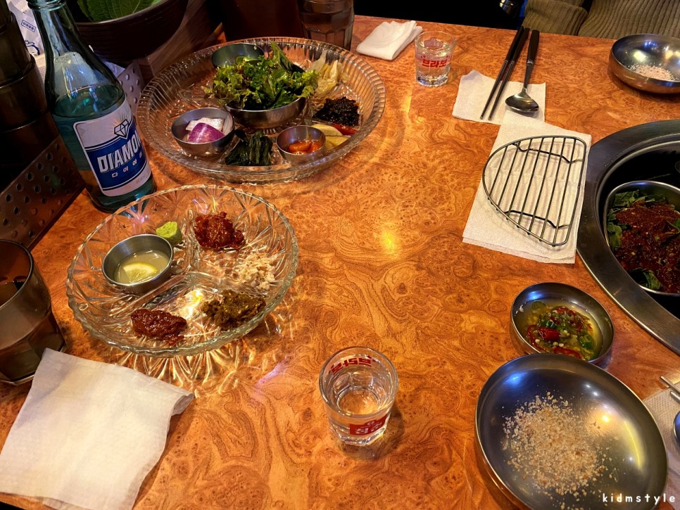 불판에 올라가있는 깻잎 양념 저게 참 맛있다.