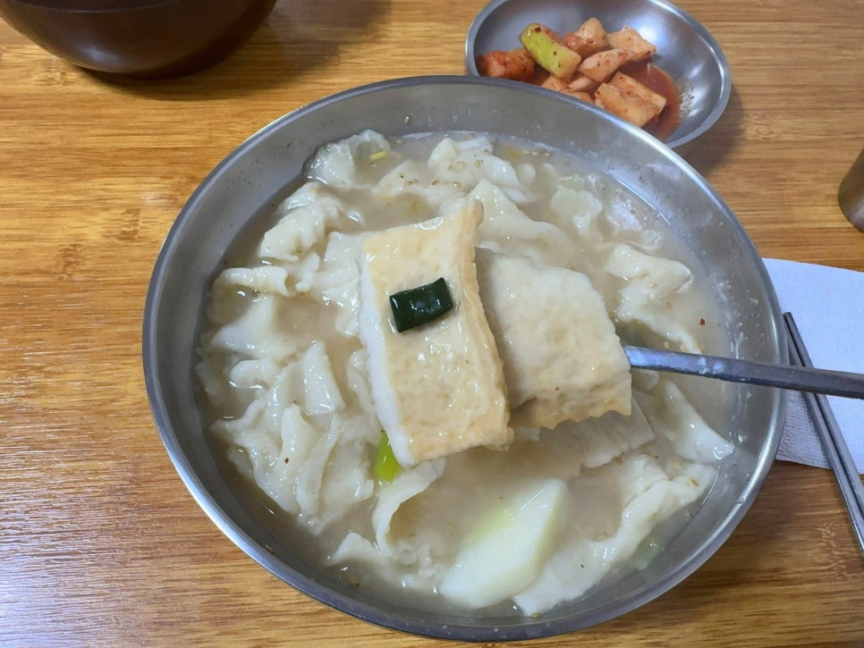 부산이라는 도시답게 자갈치 근처에 있는 식당답게 수제비에 오뎅이 들어가 있습니다.