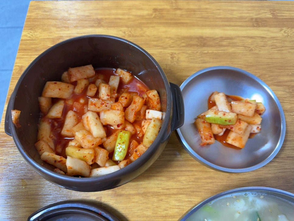 수제비와 깍두기를 담은 항아리가 함께 나왔습니다.