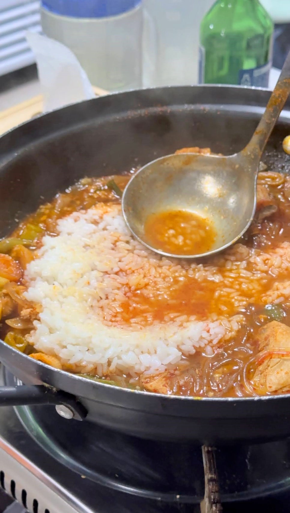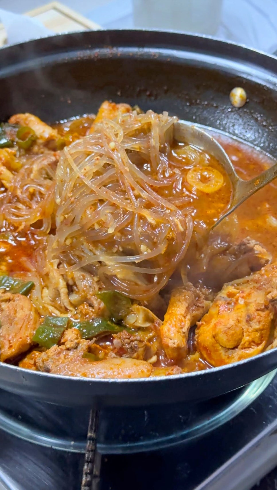닭을 어느 정도 맛봤을 때 함께 나온 당면 사리를 살짝 끓여 줍니다. 국물이 잘 스며든 당면은 호로록 면치기 하기에 딱 좋습니다.