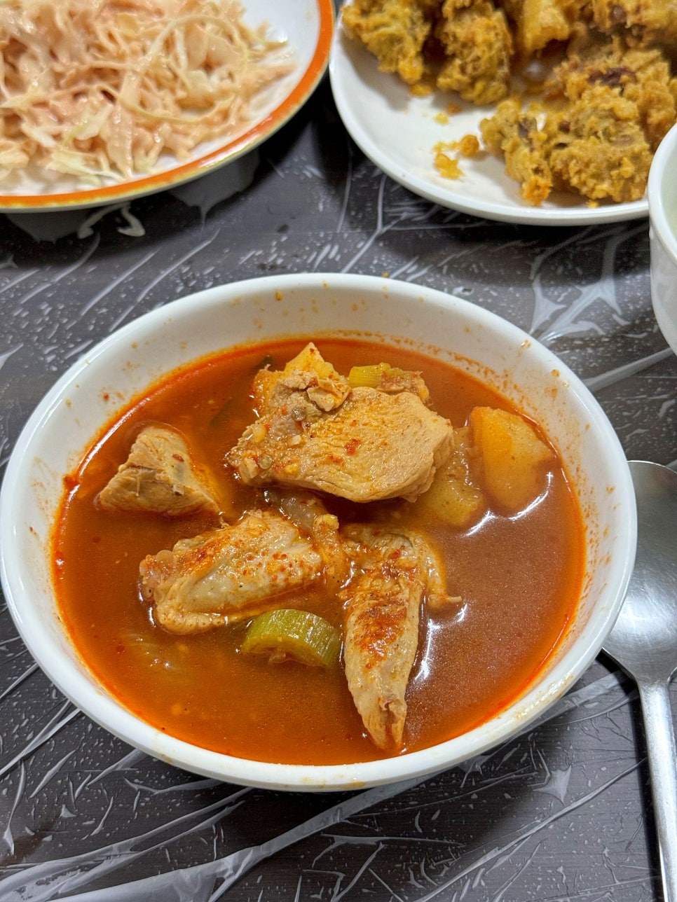 앞접시에 덜었습니다. 닭은 잘 익었고요. 국물이 잘 배었습니다. 숟가락으로 국물을 떠먹으니 너무 맛있습니다.