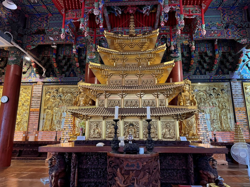 내원정사의 큰 특징 중 하나입니다. 법당 내부에 불상 대신 부처님 진신사리가 봉안된 5층 목탑이 조성되어 있습니다.