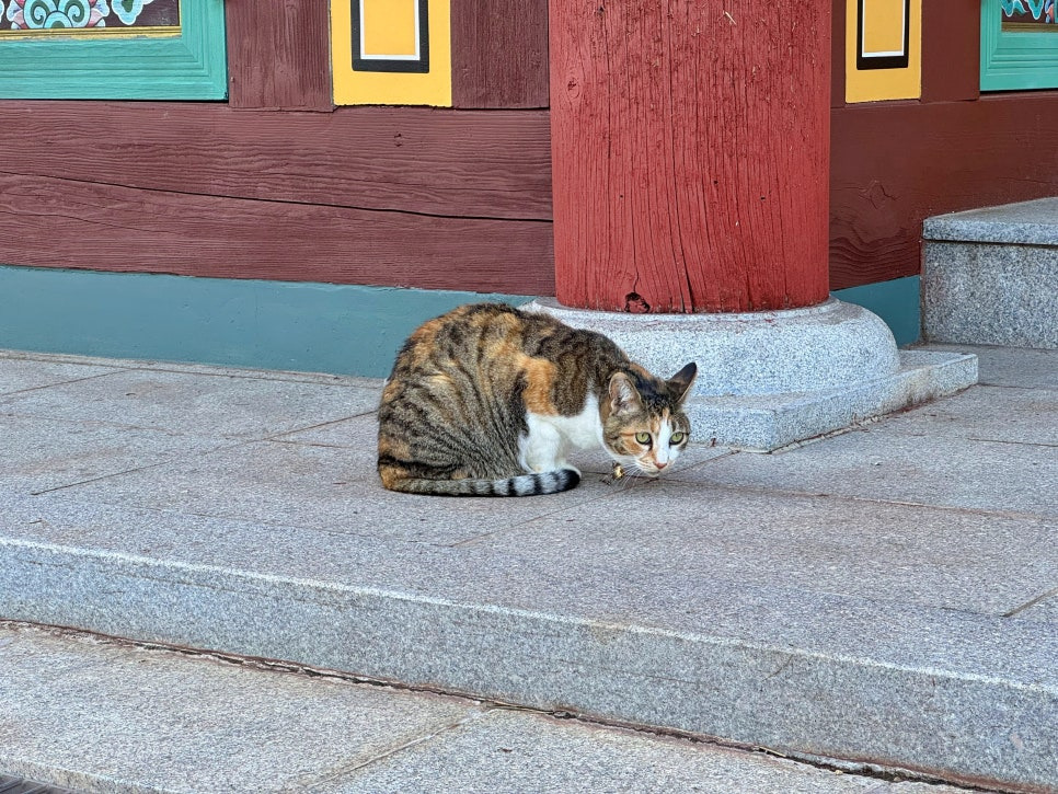 경내에 고양이가 많이 보입니다. 밥을 잘 먹어서 그런지 고양이들이 다들 귀엽더라고요. 제 발자국 소리가 낮잠 자는 고양이를 깨웠네요.