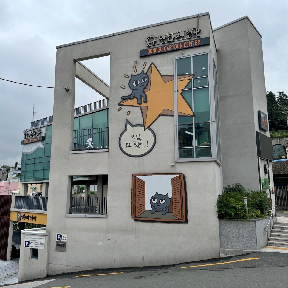 이곳은 바로 동구 만화체험관입니다. 1~2층은 지역 주민들을 위한 거주자 전용 주차장이 마련되어 있고 3층은 전시장, 옥상은 루프탑으로 운영되고 있습니다.