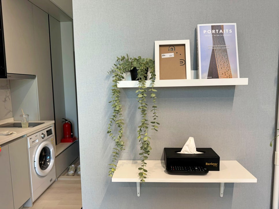 자칫 밋밋할 수 있는 공간에 식물 느낌의 인테리어가 놓여 있어서 마음에 든다.