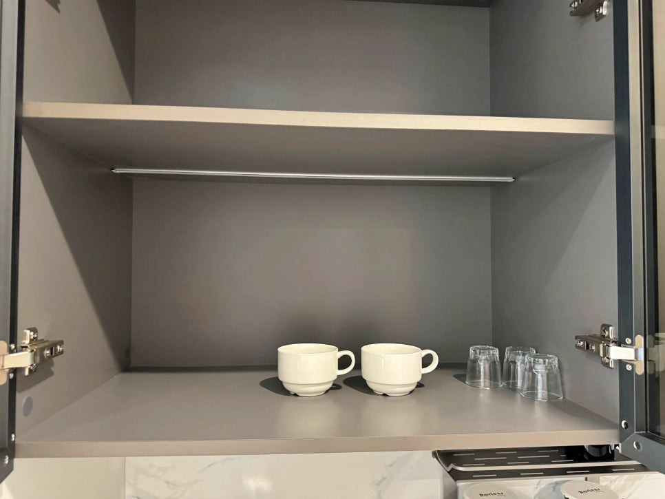 싱크대 쪽 선반도 하나씩 열어보았다. 커피잔, 소주 잔도 3개 있으니 참고하시기 바란다.