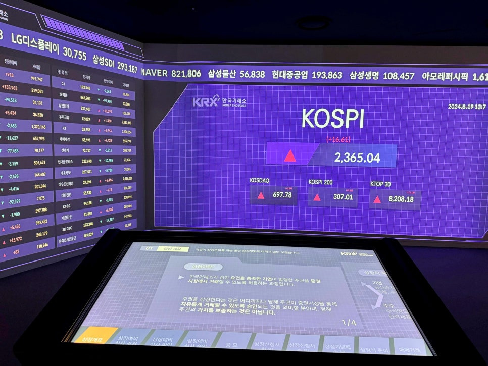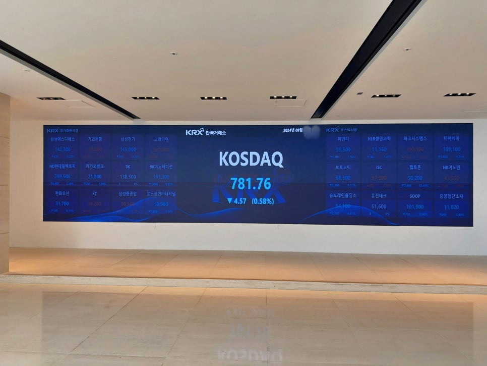 금일 증권 시황을 알리는 정보가 화면을 통해 송출되고 있는 모습입니다.