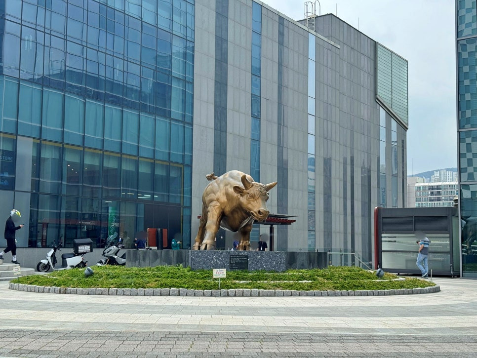 1층 마당에 커다란 황소 조형물이 있습니다. 황소 (bull)는 주식 등에서 상승장을 의미해요. 불 마켓 bull market, 불장은 장기간에 걸친 주가 상승이나 강세장을 말합니다.