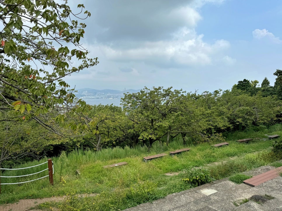 한여름이라 수풀이 무성한 이곳은 봄에 겹벚꽃이 만발하는 겹벚꽃동산입니다. 나무 사이로 보이는 바다는 부산항 북항 일대의 풍경이에요.