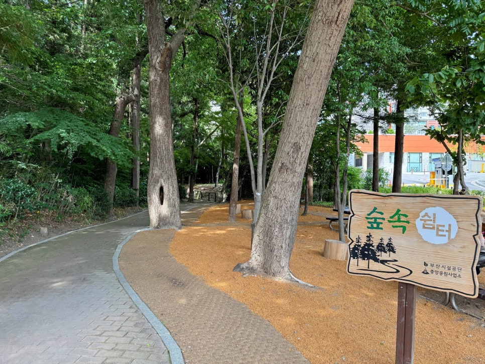 동아대학교 병원 옆으로 나있는 공원 입구에 최근 조성한 숲속 쉼터를 만날 수 있습니다. 깔끔하게 잘 정비되어 더위를 피하는 주민분들을 많이 만날 수 있습니다.