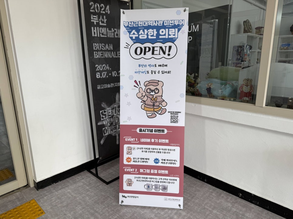 입구에서 부산근현대역사관 미션투어 '수상한 의뢰' 홍보 배너를 만날 수 있습니다.