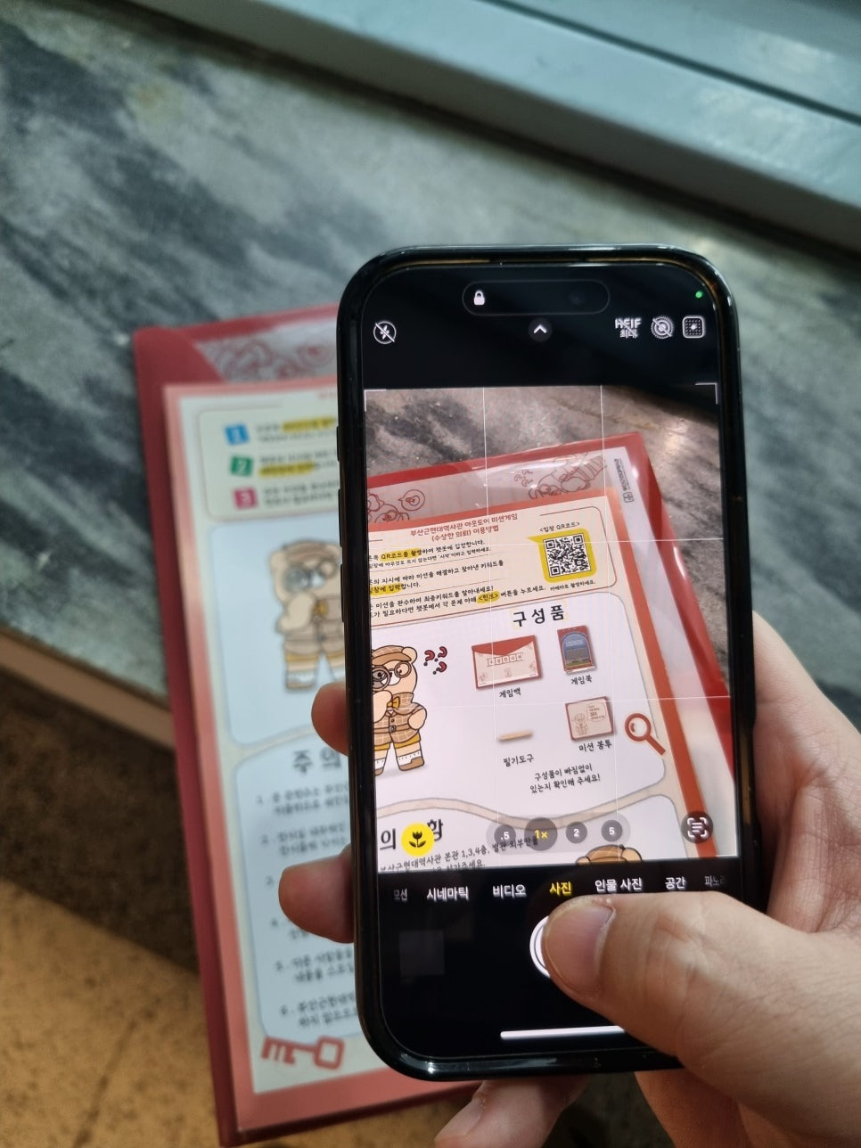 미션 키트를 열어보면 게임 진행을 설명하는 안내지가 있습니다. 스마트폰으로 QR코드를 찍어봅니다.