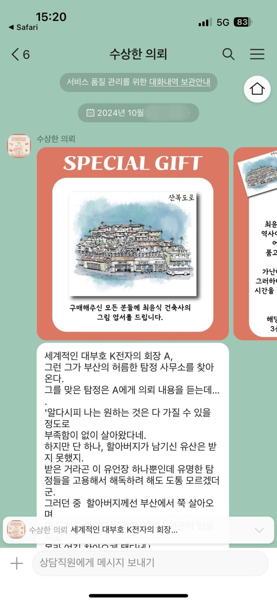 QR코드는 카카오톡 챗봇 채팅으로 이어지며 본격적으로 게임 진행을 알려요. 에피소드 1 어느 회장의 유언장이라는 게임이 드디어 시작입니다.