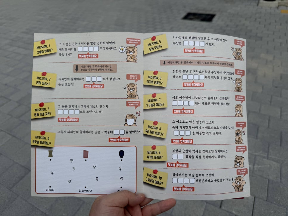 미션지를 펼쳐봅니다. 몇 가지 질문들을 통해 빈칸을 채우는 등 미션을 수행하면 되는데요. 본 게임은 부산근현대역사관 본관 및 별관을 누비며 진행하게 됩니다.