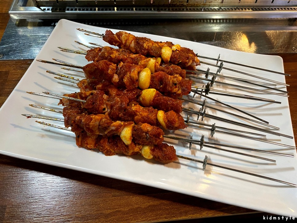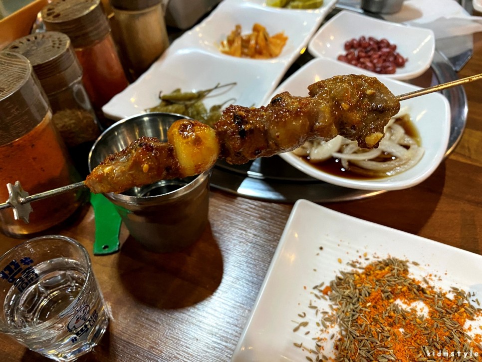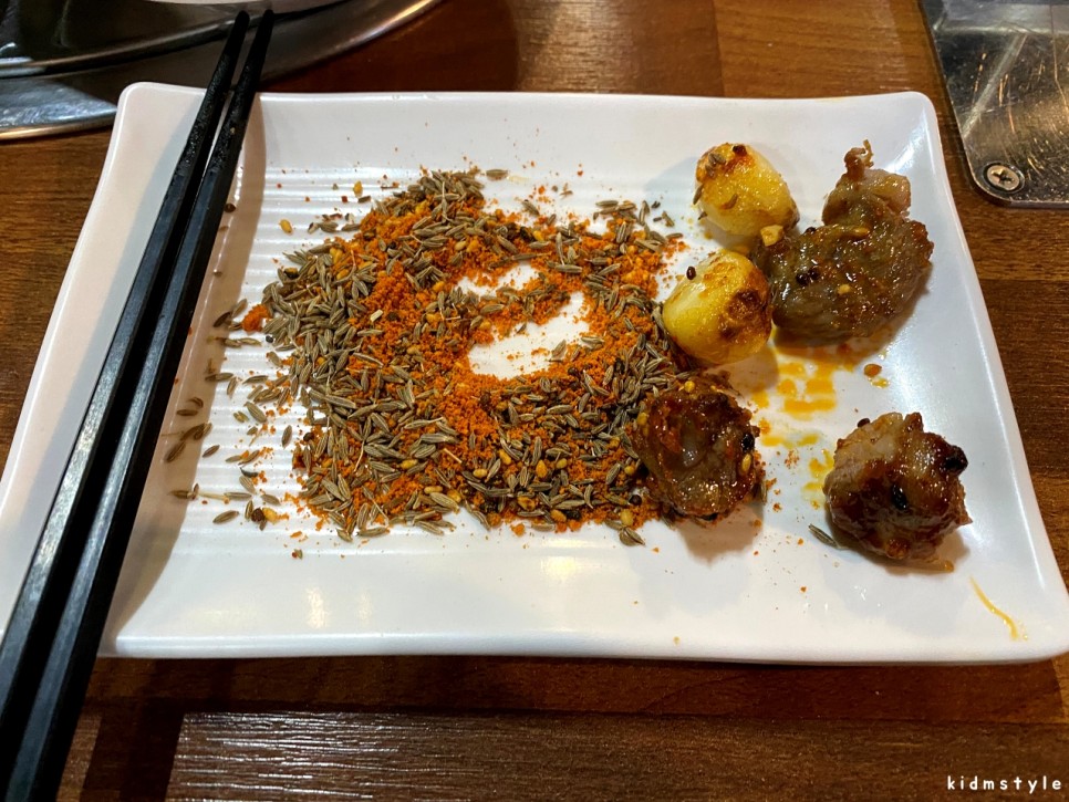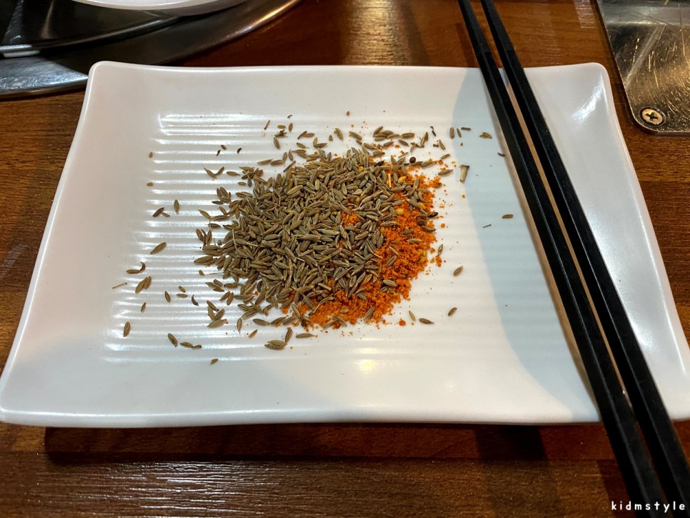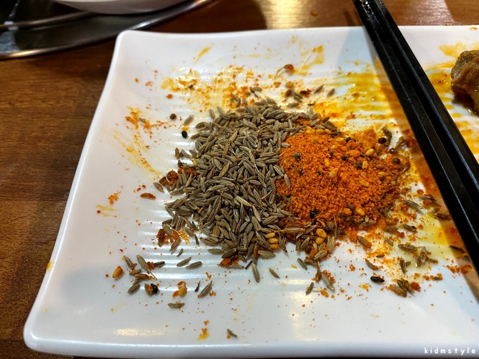쯔란과 가는 고춧가루는 테이블마다 놓여있어서 원하는 대로 뿌려 먹을 수 있다.