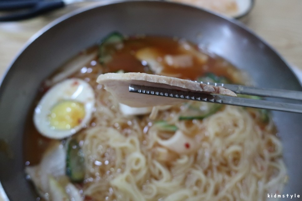 채 썬 배가 들어가 있다. 배를 고명으로 넣어주는 밀면, 참 오래간만이다.
