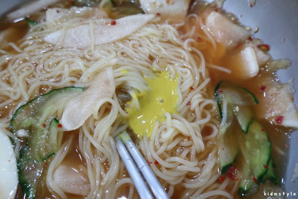 이 집 밀면에는 식초, 겨자 소스는 따로 넣지 않고 먹는 것이 더 맛있다.