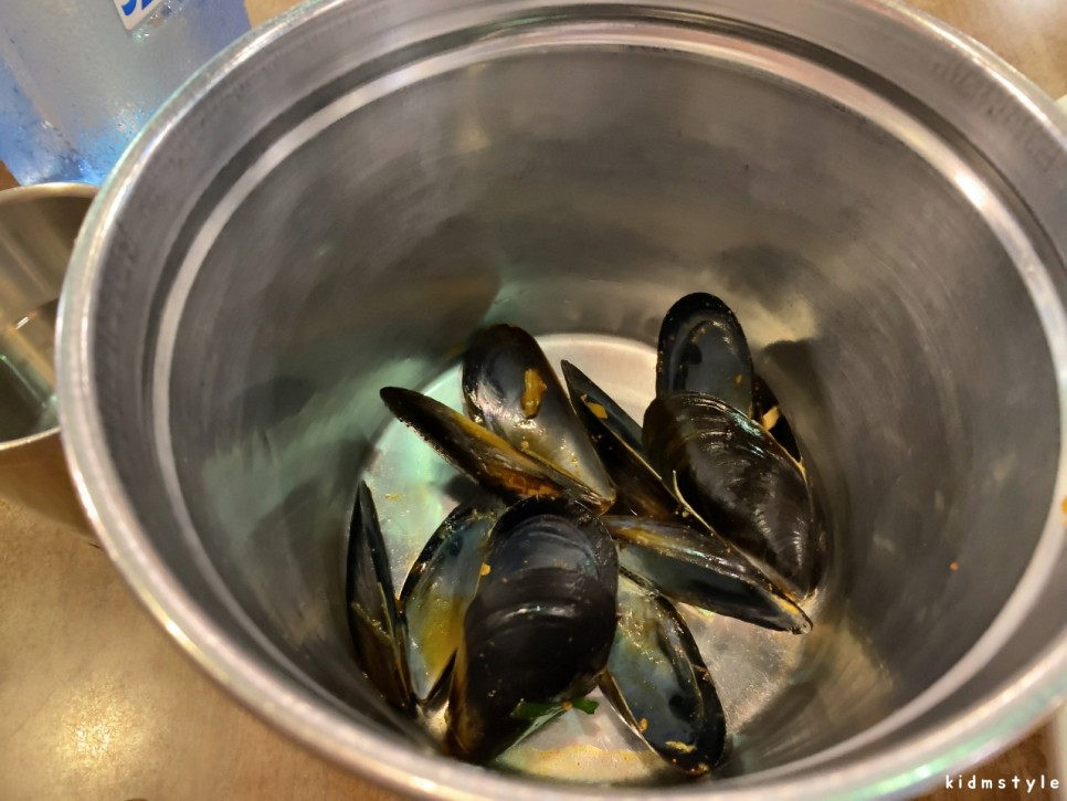 담치도 들어가 있다. 까서 껍데기는 통에 버린다.