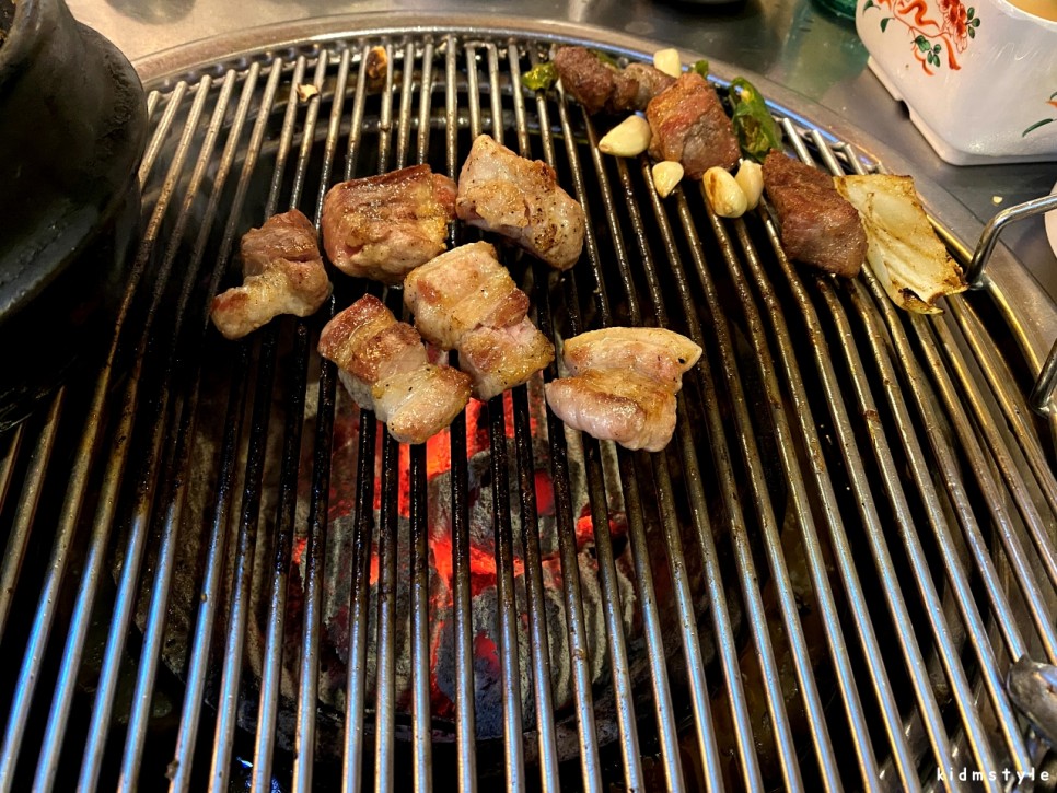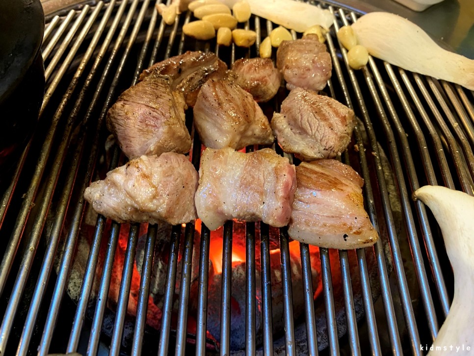 땡초, 양파, 새송이버섯을 고기와 함께 철판 볶음 스타일로 열심히 구워본다. 육즙이 그대로 살아있으면서 곁들여지는 채소들과 한 입 한다면 반할 수밖에 없는 고기이다. 아, 군침 돈다.