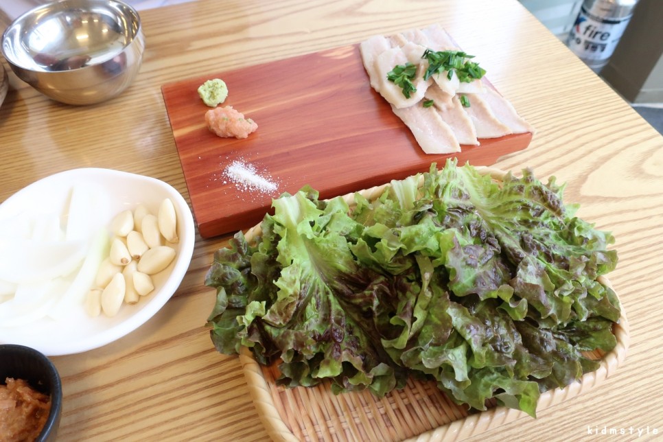 상추쌈과 생와사비, 명란, 소금, 그리고 항정수육이다. 정갈하게 세팅해놨다. 항정수육의 양이 조금 적어 보였는데 결코 적지 않았다.