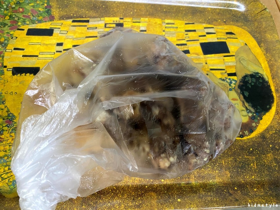 진공팩을 뜯어서 소꼬리찜을 일회용 비닐에 옮겨서 전자레인지에 5분 정도 돌린다.