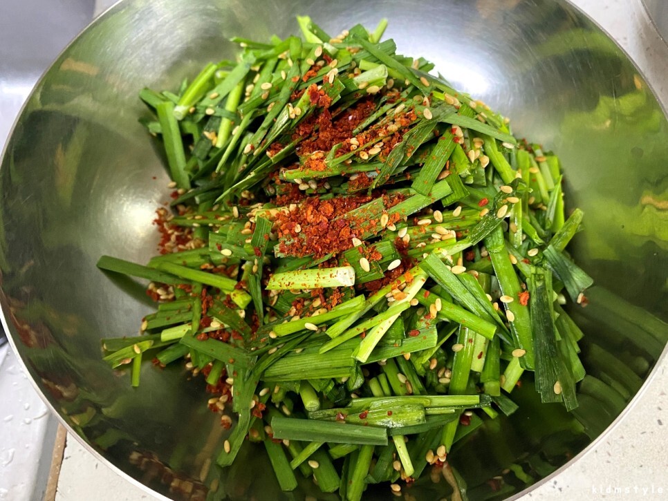 스텐 그릇에 부추와 고춧가루를 붓는다.