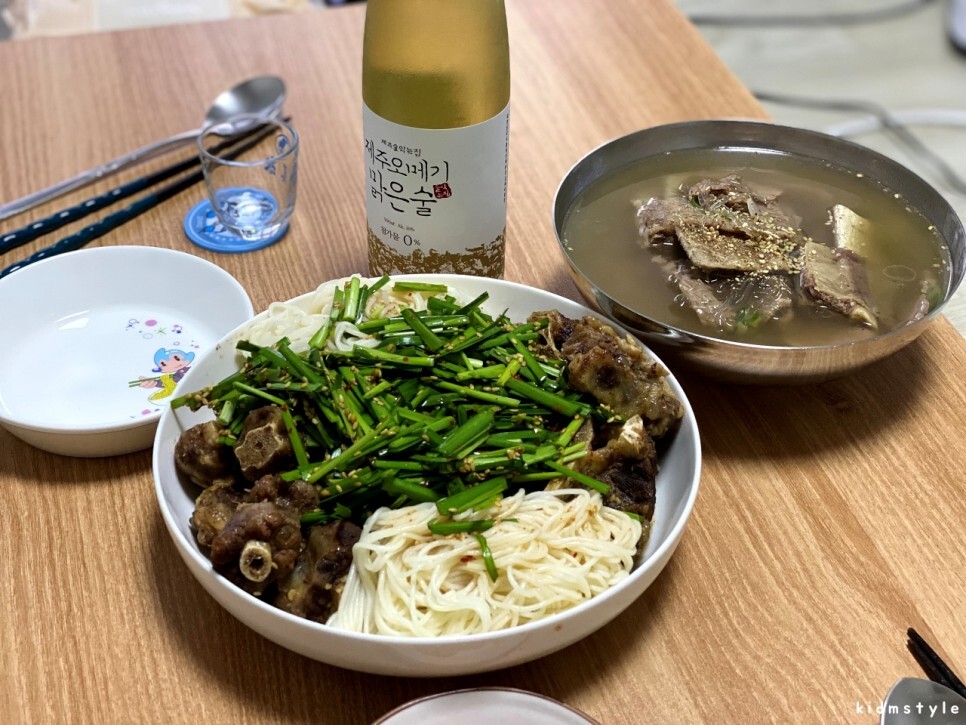 제주 오메기 맑은 술, 갈비탕, 소꼬리찜 양옆에는 잘 삶은 소면, 위에는 간장 소스에 잘 버무려진 부추.