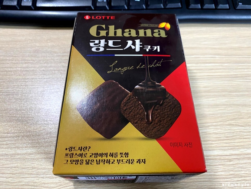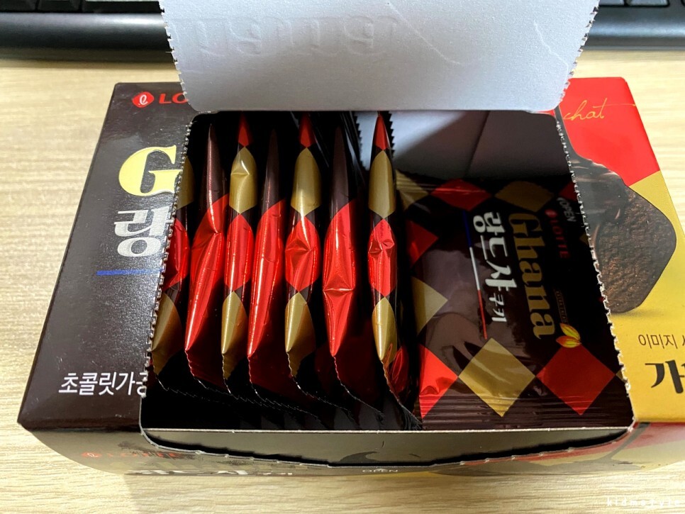 롯데제과 가나 ghana 랑드샤 쿠키이다. 사진으로 보다시피 초콜릿 기반의 제품이다. 코코아매스 6.7%, 코코아분말 1.6%가 포함되어 있다.