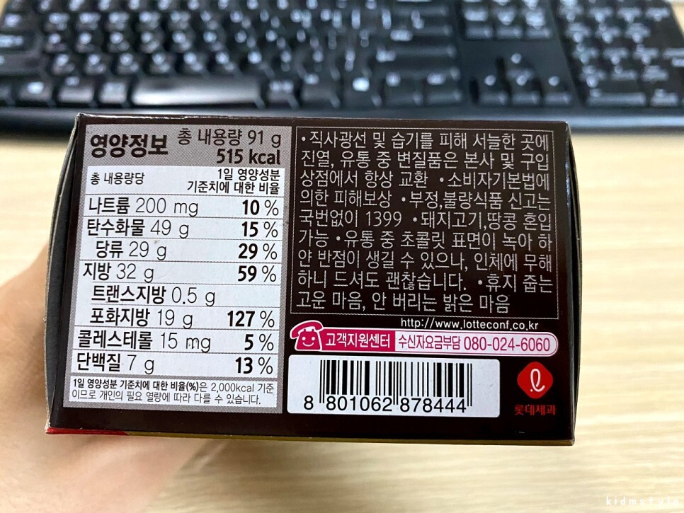 영양정보이다. 참고하기 바란다. 91g인데 515kcal, 역시 과자다.