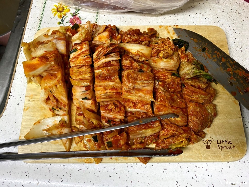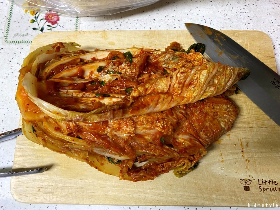 양념을 잘 치대놨네. 김치 속이 잘 자리 잡고 있다. 사진 찍고 얼른 썰어준다.