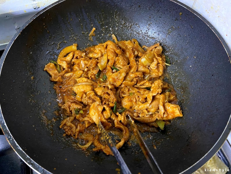 궁중팬에 식용유와 참기름을 같은 비율로 두르고 웍이 좀 달궈지면 본격적으로 고기를 넣고 볶아주면 된다.