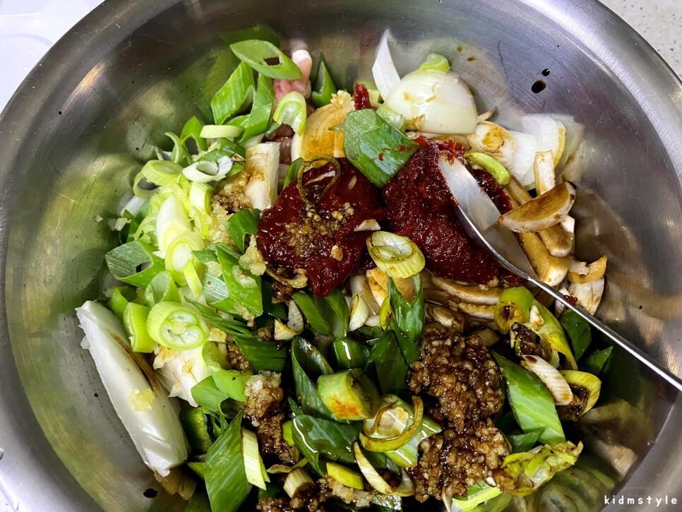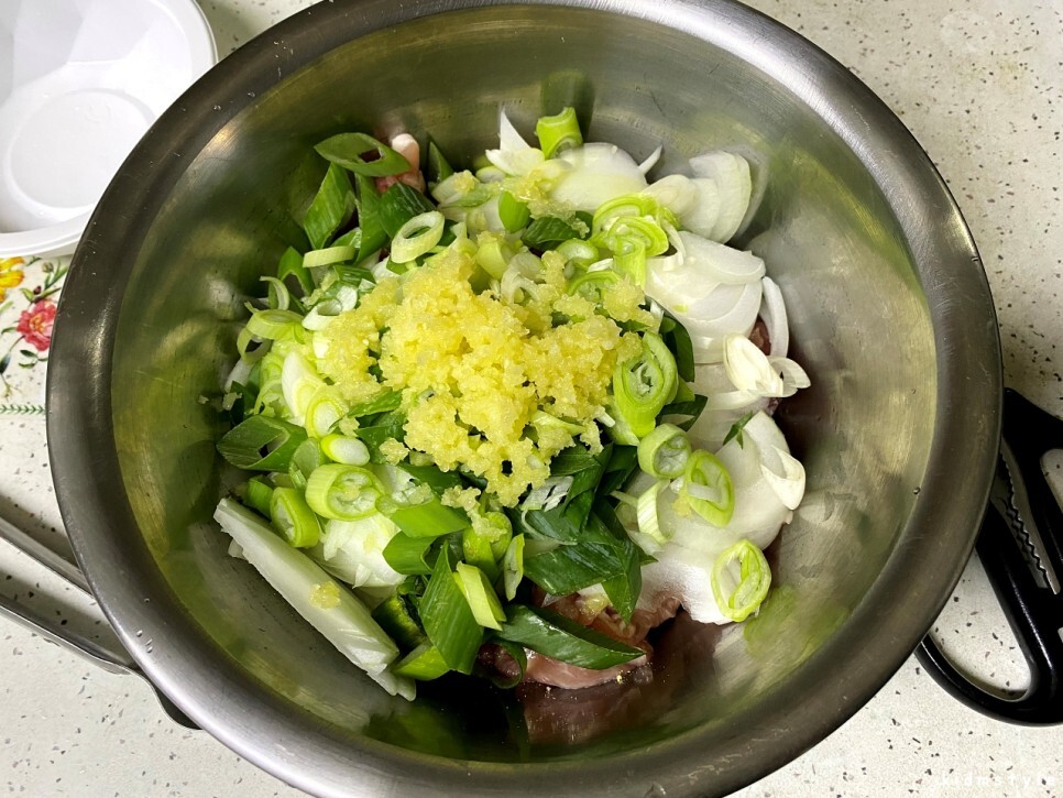 다시 본론으로 돌아온다. 양파도 썰어 넣고 대파도 썰어 넣고 마늘도 다져서 넣어본다.