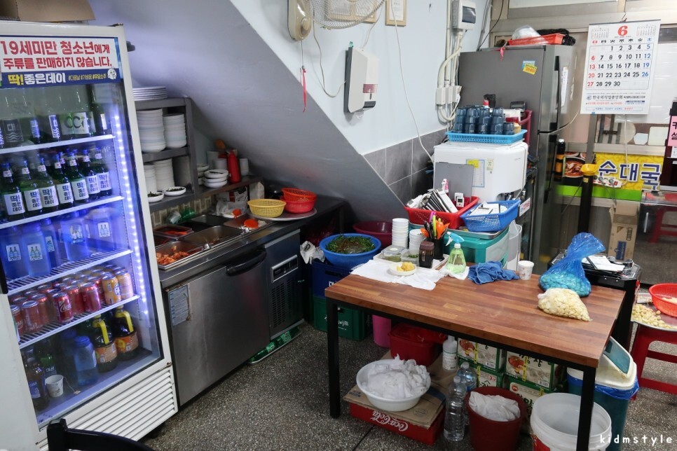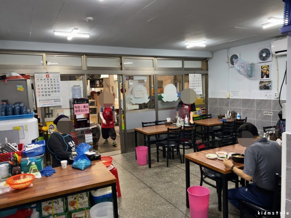 자리를 잡고 돌아보면서 입구를 향해 한 컷! 나이스 샷! 모자이크 처리 확실하니 걱정하지 말더라고. 바닥은 도끼다시 바닥. 몇몇 손님이 국밥을 핑계 삼아 낮술을 마시는 중.