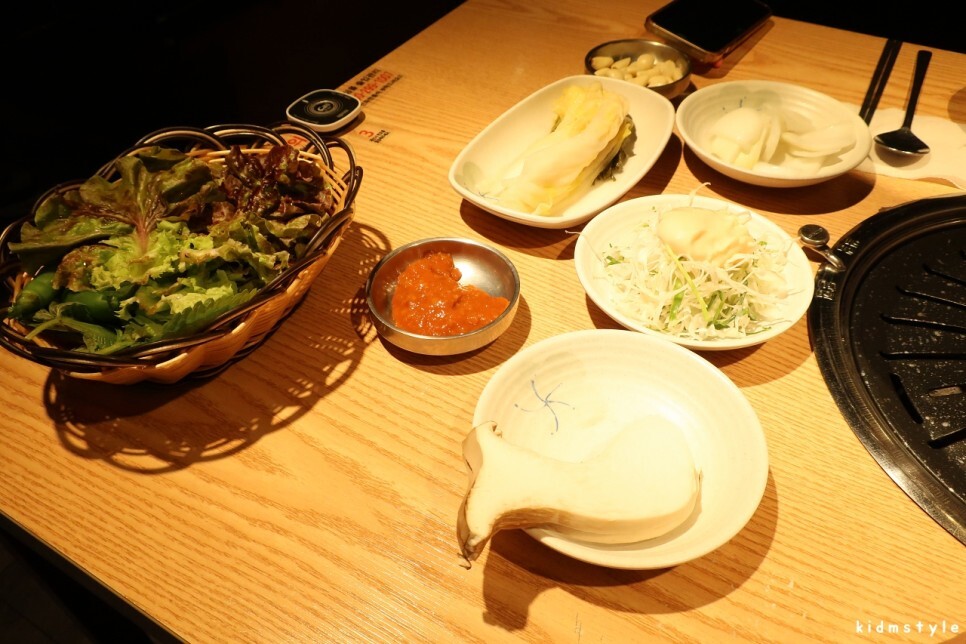 지금부터 양해를 구한다. 아이폰으로 찍으면 되는데 포스팅 제대로 해볼 거라고 카메라로 찍는 바람에 화이트밸런스가 안 맞아서 색감이 아주 별로다. 양해 바란다. 쌈, 쌈장, 백김치, 샐러드, 버섯 등이 깔린다. 지금 다시 봐도 색감이 진짜 별로네.