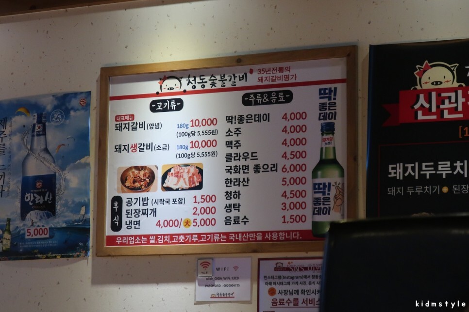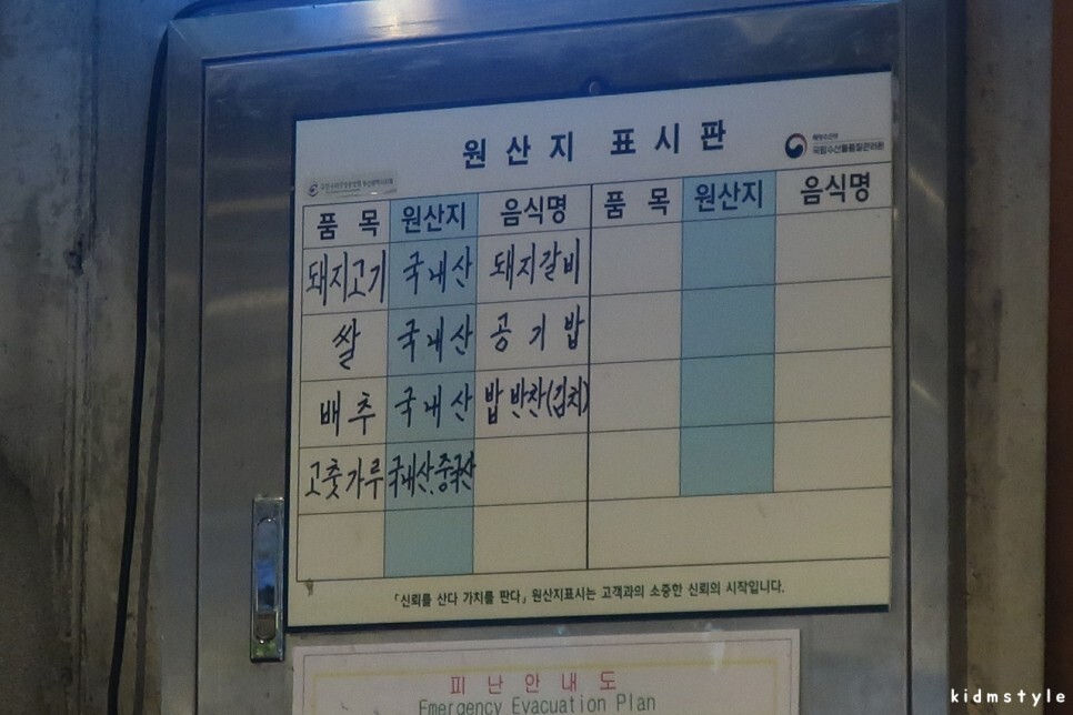자리를 잡고 메뉴판을 찍어본다. 초량 갈비 골목 대비 양념은 천 원이 비싸고 생갈비는 아주 약간 비싸다. 어쨌든 비싼 건 비싼 거다. 섬이라서 그런가? 쌀, 김치, 고춧가루, 고기류는 국내산만을 사용한단다.