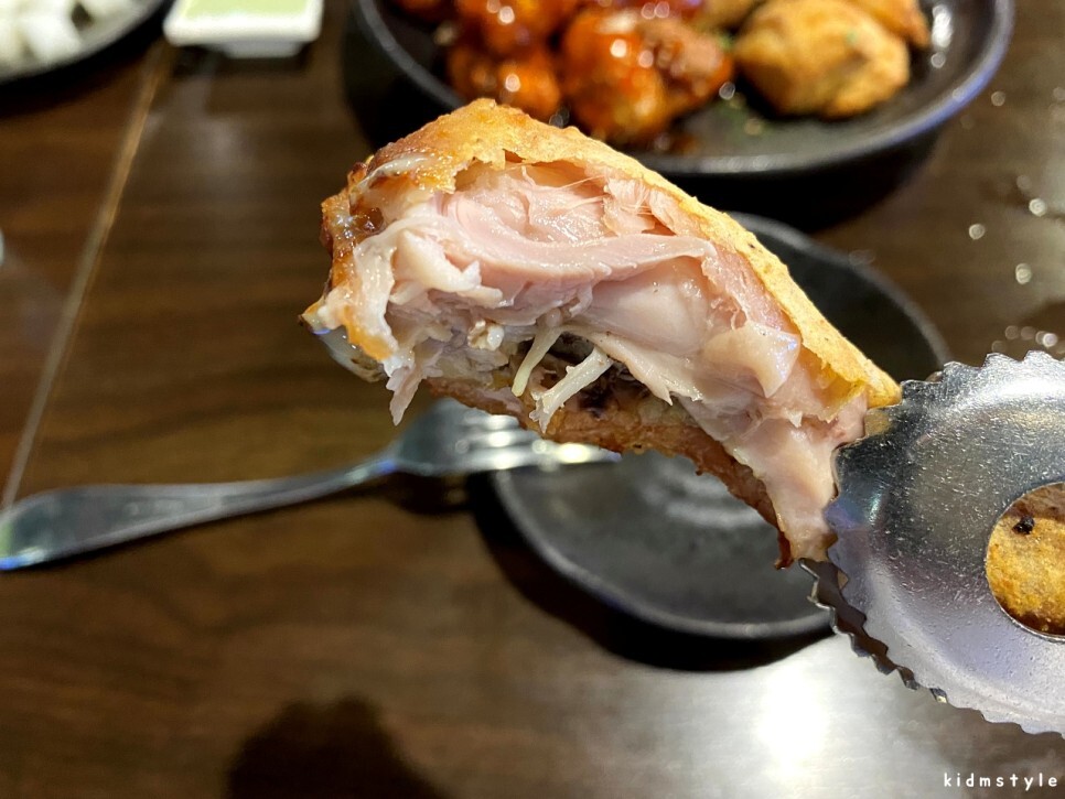 속살을 살펴보니 잘 익었다. 오꾸닭에 오면 버릇처럼 하는 행동이다. 예전에 가끔 가던 근처의 모 오꾸닭 지점에서 몇 번이나 속이 제대로 익지 않아서 재요청하고 먹었고 그 정도가 지나쳐서 그 뒤로 발길을 끊었다. 지점별로 편차는 분명히 있는 것 같다.