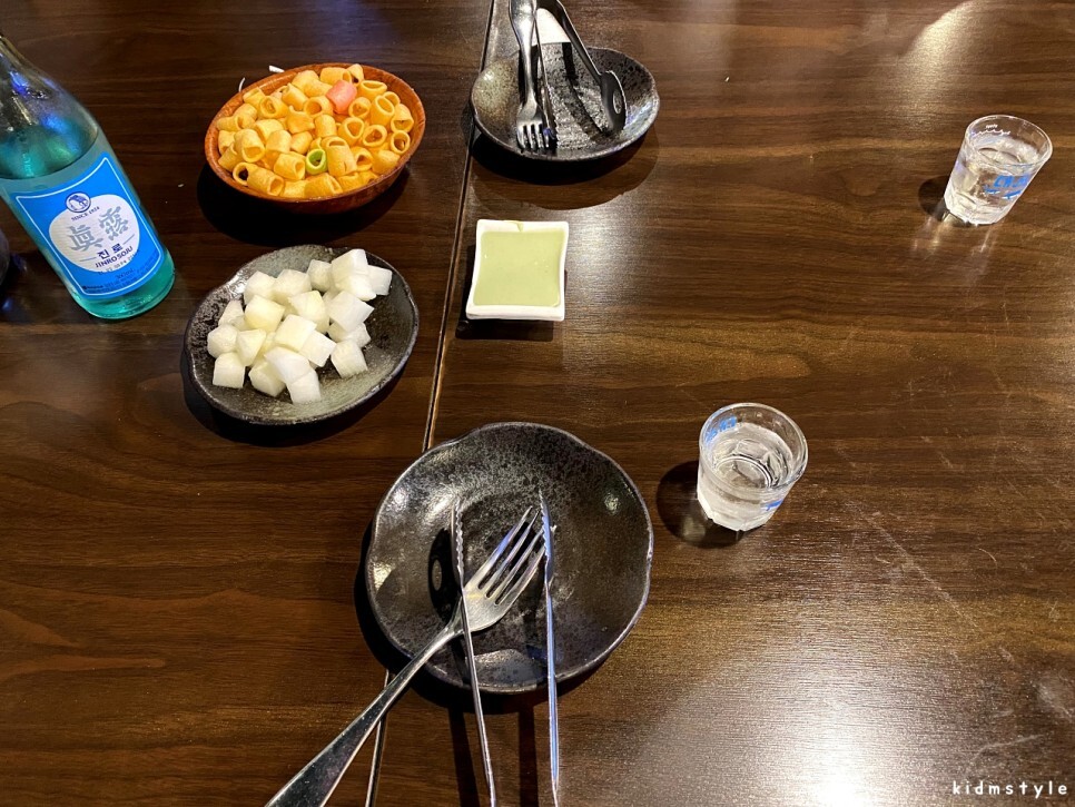 진로 한 병 주문한다. 뻥과자와 무는 기본으로 나오고 소스는 선택할 수 있다.