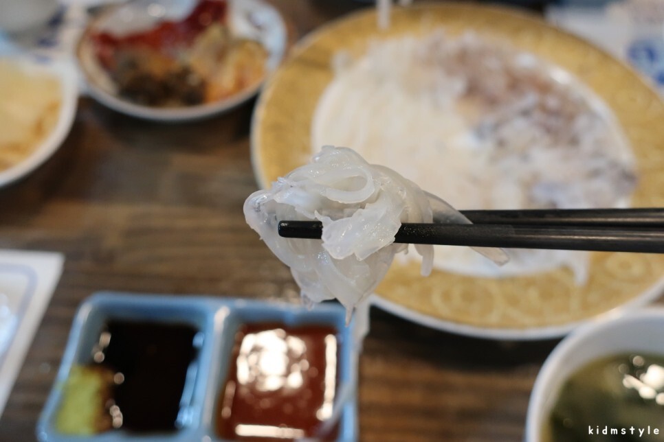 오징어회를 한 젓가락 집어서 먹기 전에 한 컷