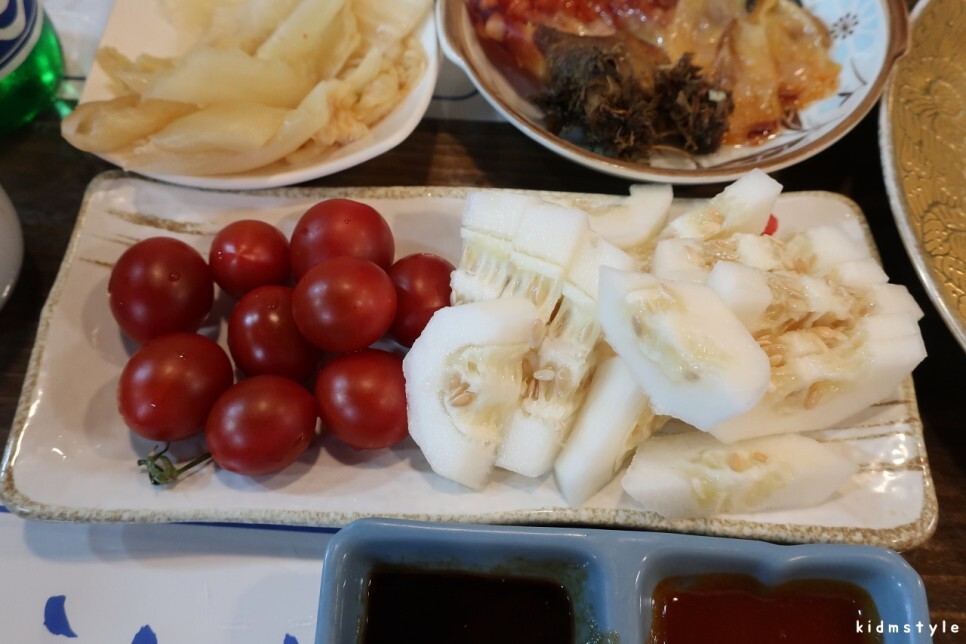 먹다 보니 과일 안주도 나온다. 방울토마토와 참외