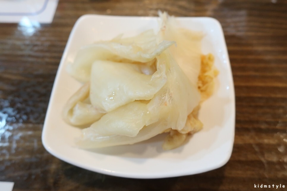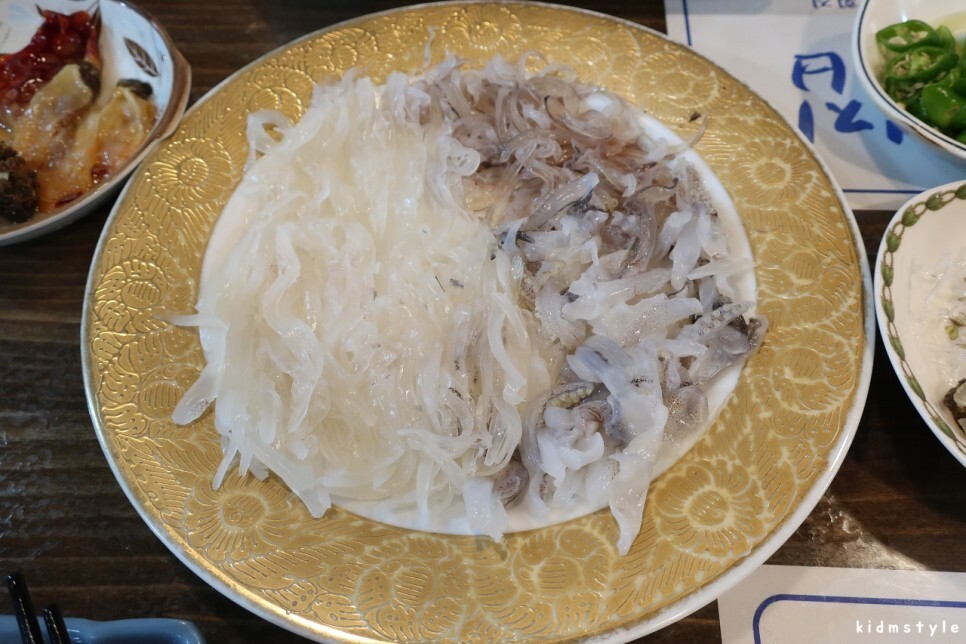 드디어 오징어회가 나왔다. 한 접시에 4만 원이다. 어찌 보면 비싸다 싶지만 양이 꽤 많다. 그리고 제공되는 안주를 생각하면 절대 비싸지 않은 금액이다. 오징어는 일부러 얇게 썰어달라고 요청했다.
