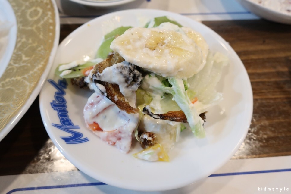 황태껍질튀김 과일 샐러드이다. 좋아하는 황태껍질이라 내가 다 먹는다.