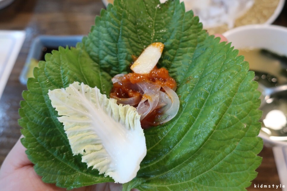 깻잎, 마늘, 쌈장, 배추, 오징어 한 쌈을 싸서 먹어본다.
